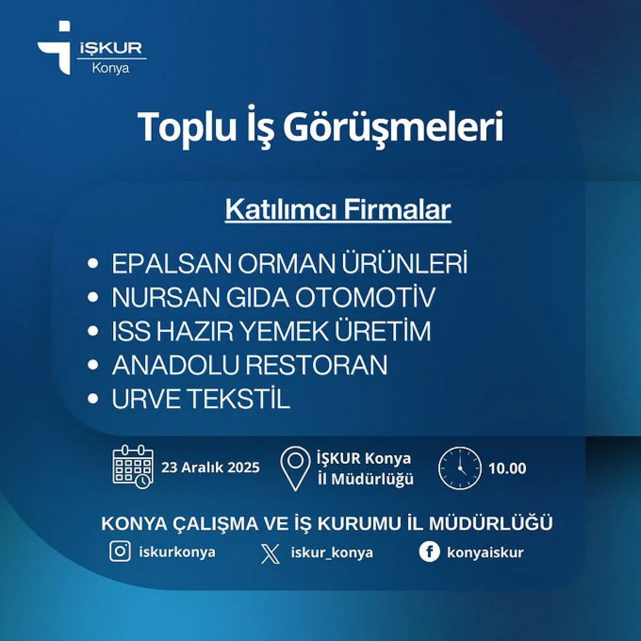23 Aralık 2025 Salı günü saat 10.00’da başlayacak olan toplu iş görüşmelerine, Konya’nın üretim ve hizmet kapasitesine önemli katkılar sunan beş büyük firma katılım sağlayacak. EPALSAN Orman Ürünleri, NURSAN Gıda Otomotiv, ISS Hazır Yemek Üretim, Anadolu Restoran ve Urve Tekstil gibi sektörlerinde öncü olan kuruluşlar farklı departmanlardaki personel ihtiyaçlarını karşılamak üzere adaylarla yüz yüze görüşecek.