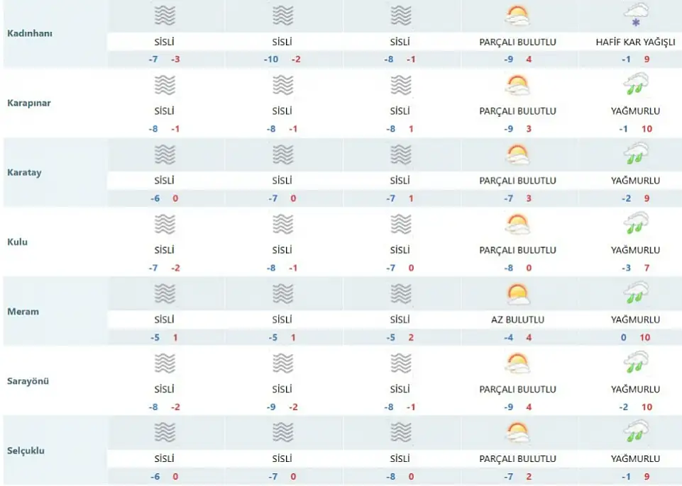 Konya genelinde önümüzdeki hafta soğuk ve sisli hava etkisini sürdürecek. Meteoroloji verilerine göre şehir merkezi ve ilçelerin büyük bölümünde haftanın ilk günlerinde yoğun sis beklenirken, gece sıcaklıkları sıfırın altında seyredecek