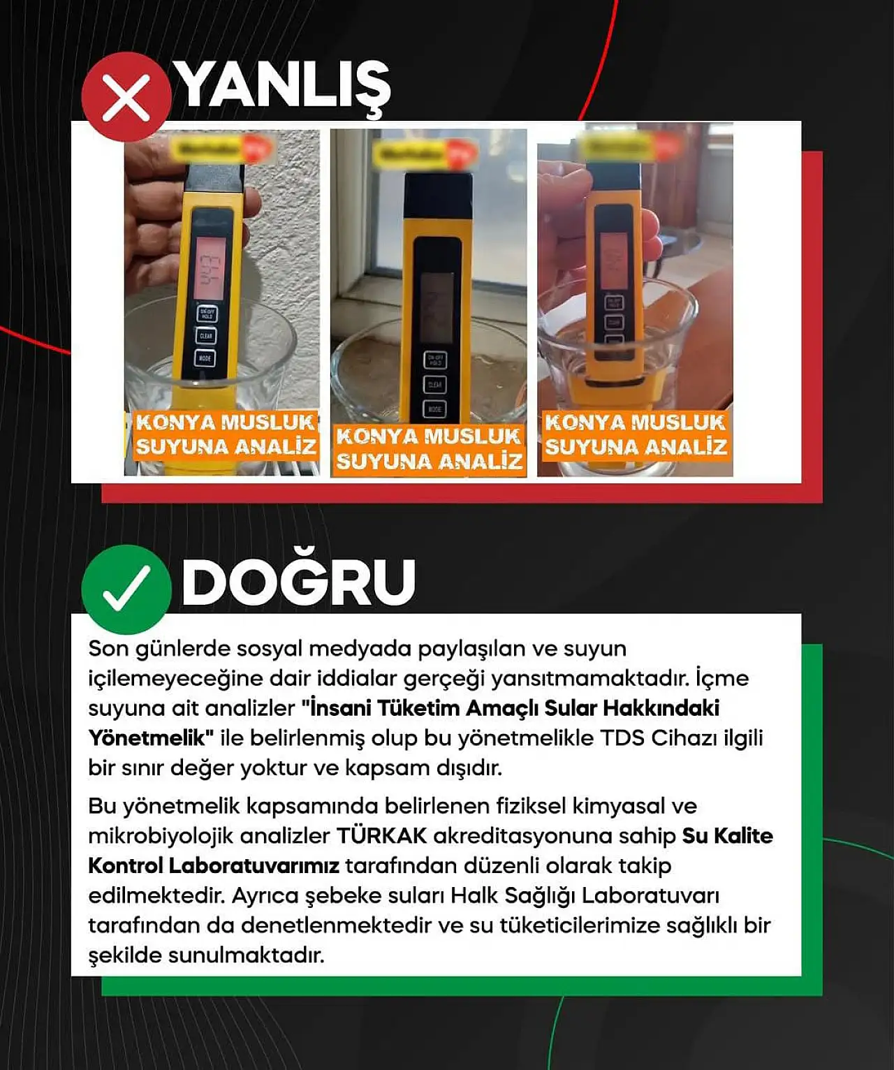 Yetkililer, Konya genelinde şebekeye verilen suyun mevzuata uygun, güvenli ve sağlıklı olduğunu vurgulayarak, vatandaşların sosyal medyada yer alan doğruluğu teyit edilmemiş paylaşımlar yerine resmi kurumların açıklamalarını dikkate almaları çağrısında bulundu. Açıklamada, kamuoyunu yanıltıcı bilgilerin endişeye yol açmaması için doğru bilginin resmi kanallardan takip edilmesinin önemine dikkat çekildi.