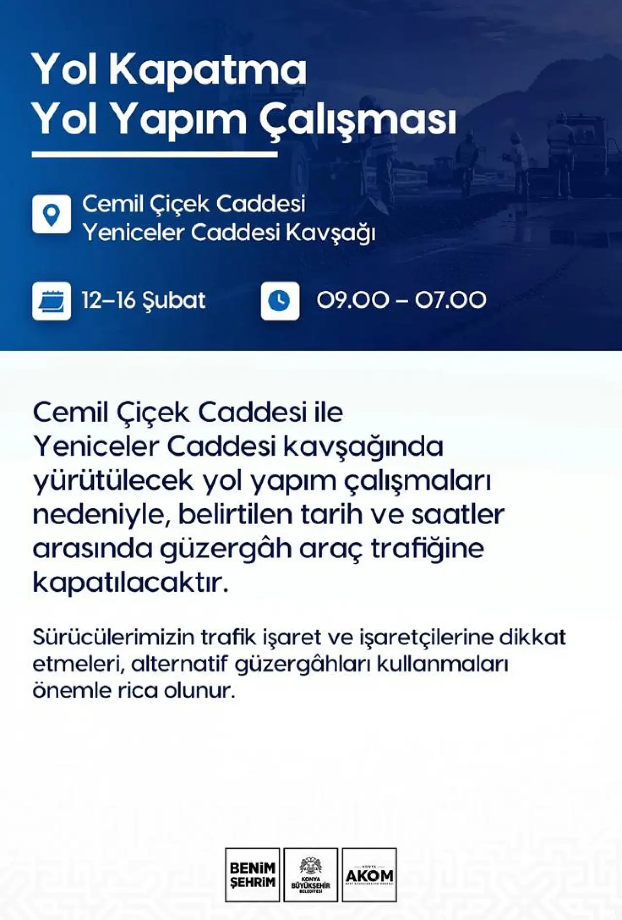Konya Büyükşehir Belediyesi Afet ve Koordinasyon Merkezi (AKOM), şehir merkezindeki trafik akışını etkileyecek yol çalışması duyurusu yaptı. Yapılan açıklamaya göre Cemil Çiçek Caddesi ile Yeniceler Caddesi Kavşağı'nda gerçekleştirilecek yol yapım çalışmaları nedeniyle ilgili güzergâh geçici süreliğine araç trafiğine kapatılacak.
