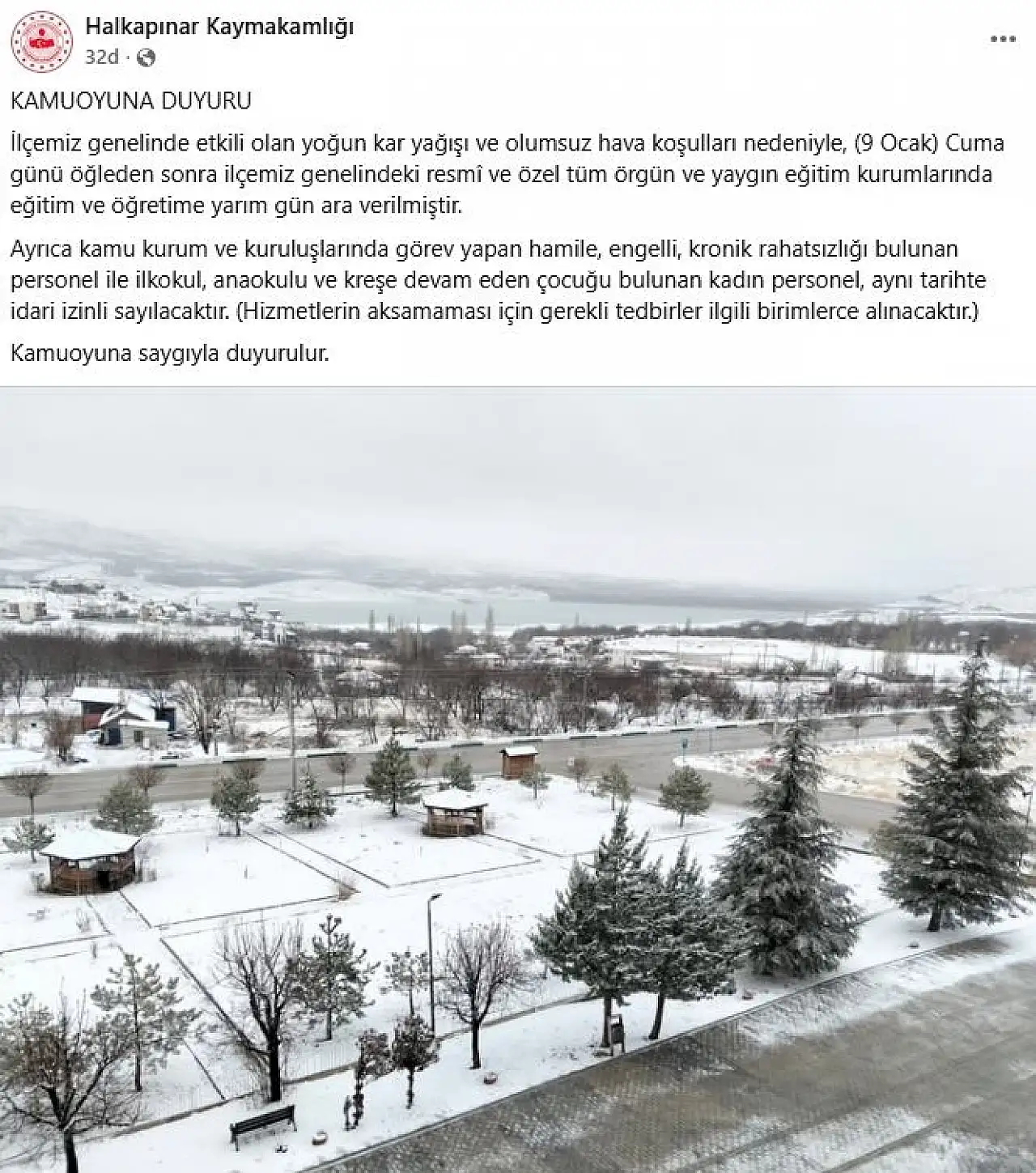 Konya'da Halkapınar Kaymakamlığı'ndan yapılan açıklamaya göre olumsuz hava koşulları nedeniyle 9 Ocak Cuma günü öğleden sonra ilçe genelindeki resmi ve özel tüm örgün ve yaygın eğitim kurumlarında eğitim ve öğretime yarım gün süreyle ara verildi. Kararın özellikle taşımalı eğitim gören öğrencilerin ve öğretmenlerin ulaşım güvenliğini sağlamak amacıyla alındığı belirtildi.