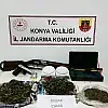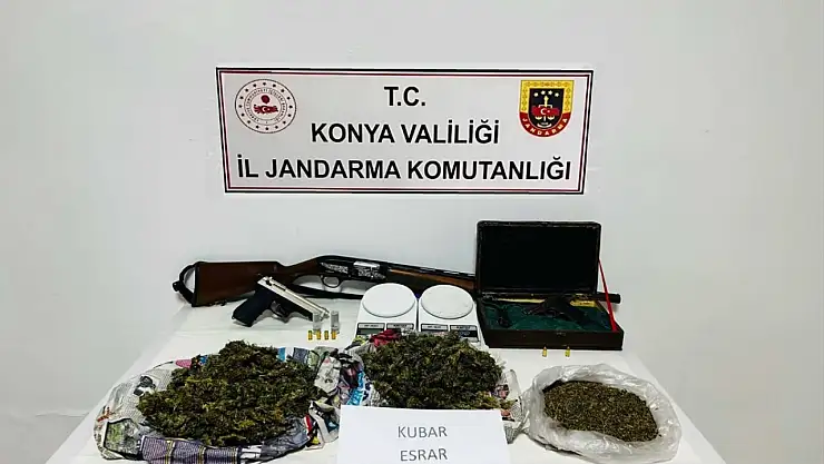 Ekipler, baskın düzenledikleri bir adreste yaptıkları aramada 715 gram esrar, 2 hassas terazi, 2 tabanca, 1 tüfek ve bir miktar fişek ele geçirdi.