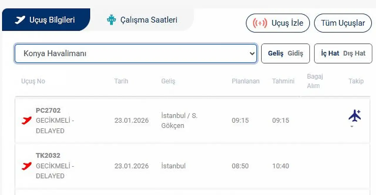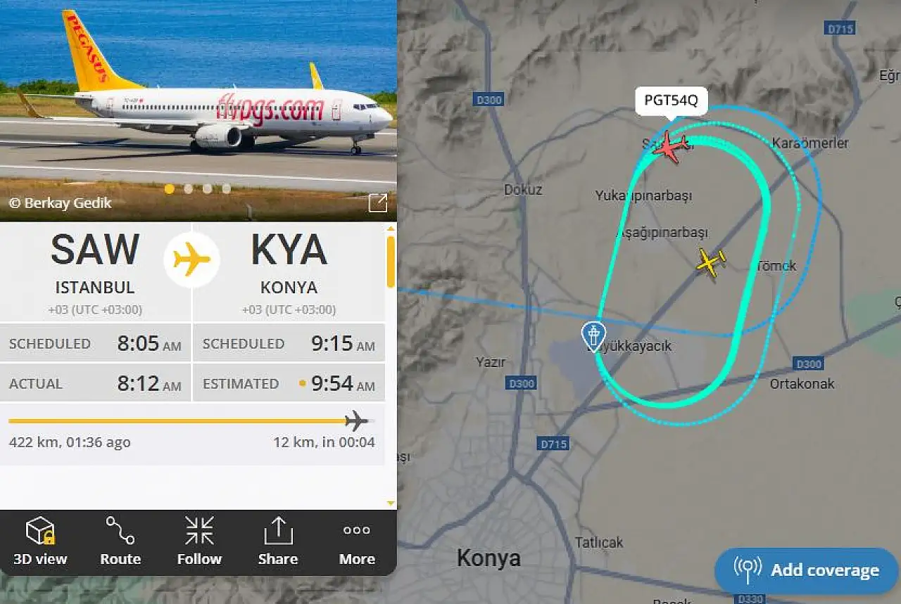 İstanbul Sabiha Gökçen Havalimanı'ndan kalkış yapan PC2702 sefer sayılı Pegasus uçağı, Konya semalarına ulaştığında yoğun sis engeliyle karşılaştı. Uçuş takip verilerine göre sis nedeniyle piste teker koyamayan uçak Konya üzerinde uzun süre tur atmak zorunda kaldı. Saat 09:15’te iniş yapması planlanan uçağın tahmini iniş saati yaşanan hava muhalefeti nedeniyle gecikti. Planlanan iniş saati 09:15 olan uçağın, hava muhalefeti nedeniyle saat 10:50 civarında iniş yapabileceği öngörülüyor. Sadece Pegasus değil Türk Hava Yolları’nın İstanbul Havalimanı’ndan gerçekleştirdiği TK2032 sefer sayılı uçuşu da sis engeline takıldı. İniş saati 08:50 olan uçağın, hava muhalefeti nedeniyle saat 10:40 civarında iniş yapması bekleniyor.