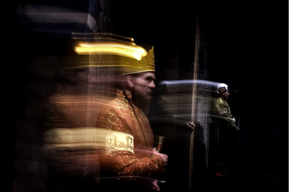 Hükümdarlar, duruşları, bakışları, saçları, sakalları ve yüz ifadeleriyle dikkati çekiyor.