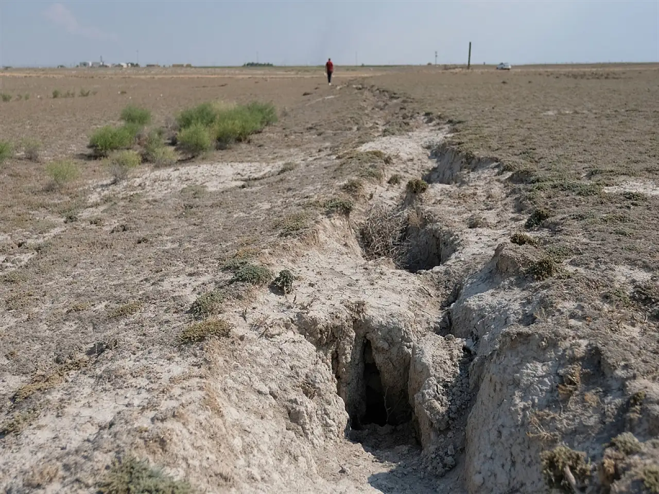 Obruğun yanında bir de yüzey yarıkları var. Aslında son günlerde çokça gündeme geliyor. Yer altı suyunun çekilmesi, aşırı kuraklıktan dolayı aktif ya da pasif enerjini kaybetmiş fay hatlarını oluşturan birbirinden farklı seviyelerde litolojiye sahip blokları oluşturan kil minerallerinin hacimlerindeki küçülme ve büzüşme farklı seviyelerde seyretmektedir. Buna bağlı olarak da fay hattı boyunca yarıklar gün yüzüne çıkıyor ve bu yarılmalar arasında bu bloklar zaman içerisinde kademe diye adlandırdığımız merdiven şeklinde basamaklar oluşuyor."