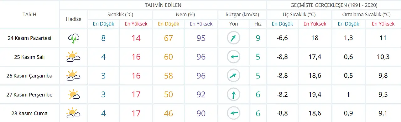 Meteoroloji 8. Bölge Müdürlüğü, 24 Kasım Pazartesi günü Konya merkez ve çevre ilçelerde kuvvetli sağanak geçişlerinin beklendiğini duyurdu. Yağışla birlikte zaman zaman kuvvetli rüzgâr ve yer yer gök gürültüsü görülebileceği bildirildi.