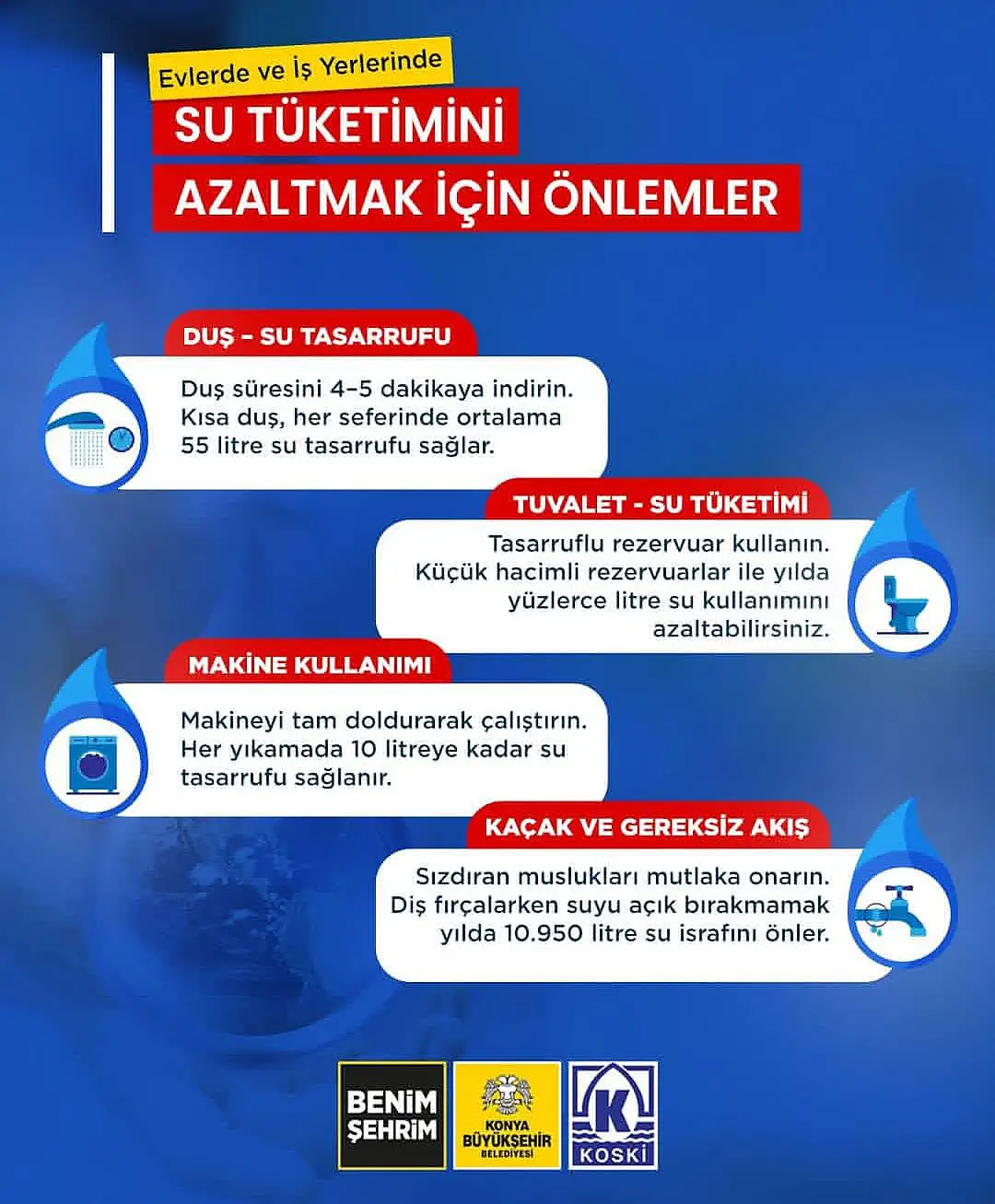 Görselde dikkat çekilen bir diğer önemli konu ise tuvaletlerde kullanılan su miktarı. Konya Büyükşehir Belediyesi, tasarruflu rezervuar kullanımının yılda yüzlerce litre suyun korunmasını sağladığını açıkladı. Küçük hacimli rezervuarların, özellikle evlerde en çok suyun harcandığı bölümlerin başında gelen tuvalet tüketimini ciddi oranda düşürdüğü ifade edildi.