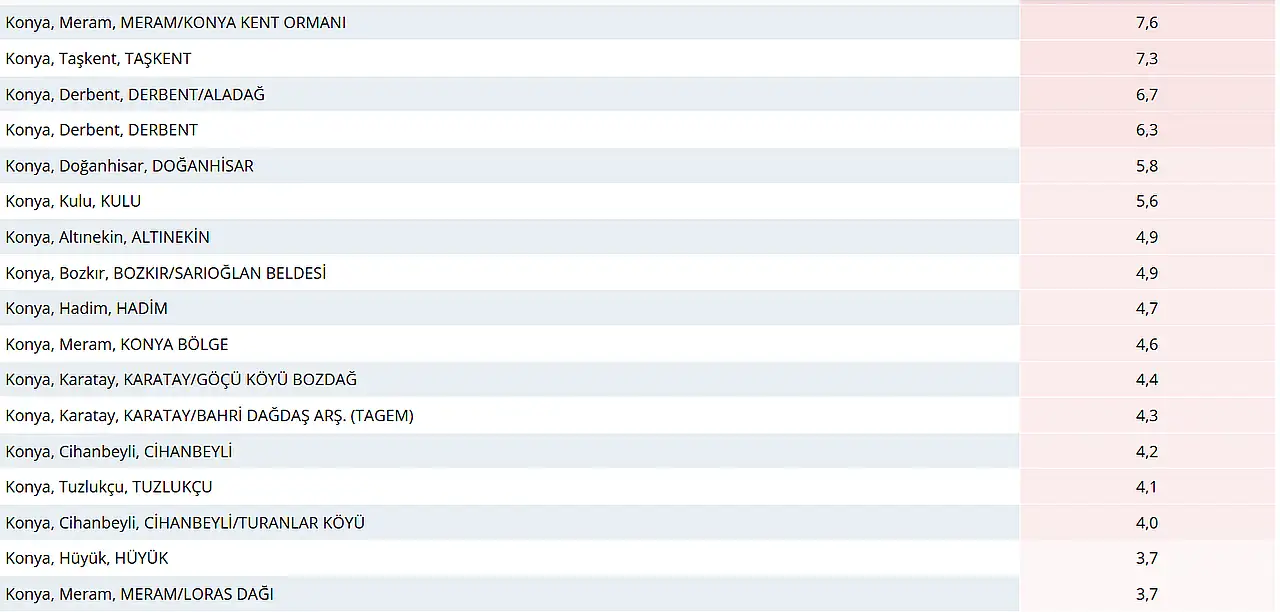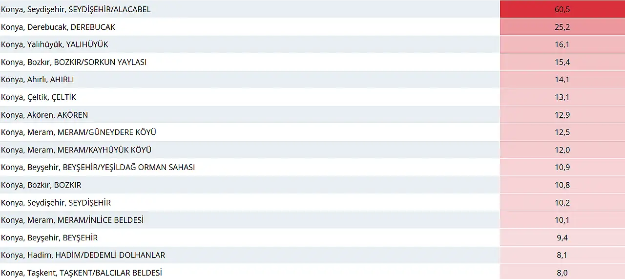 Meteoroloji Genel Müdürlüğü’nün verilerine göre toplam yağış bazında rekor Konya’nın Seydişehir ilçesindeyken en az yağış Sarayönü ilçesinde gerçekleşti.