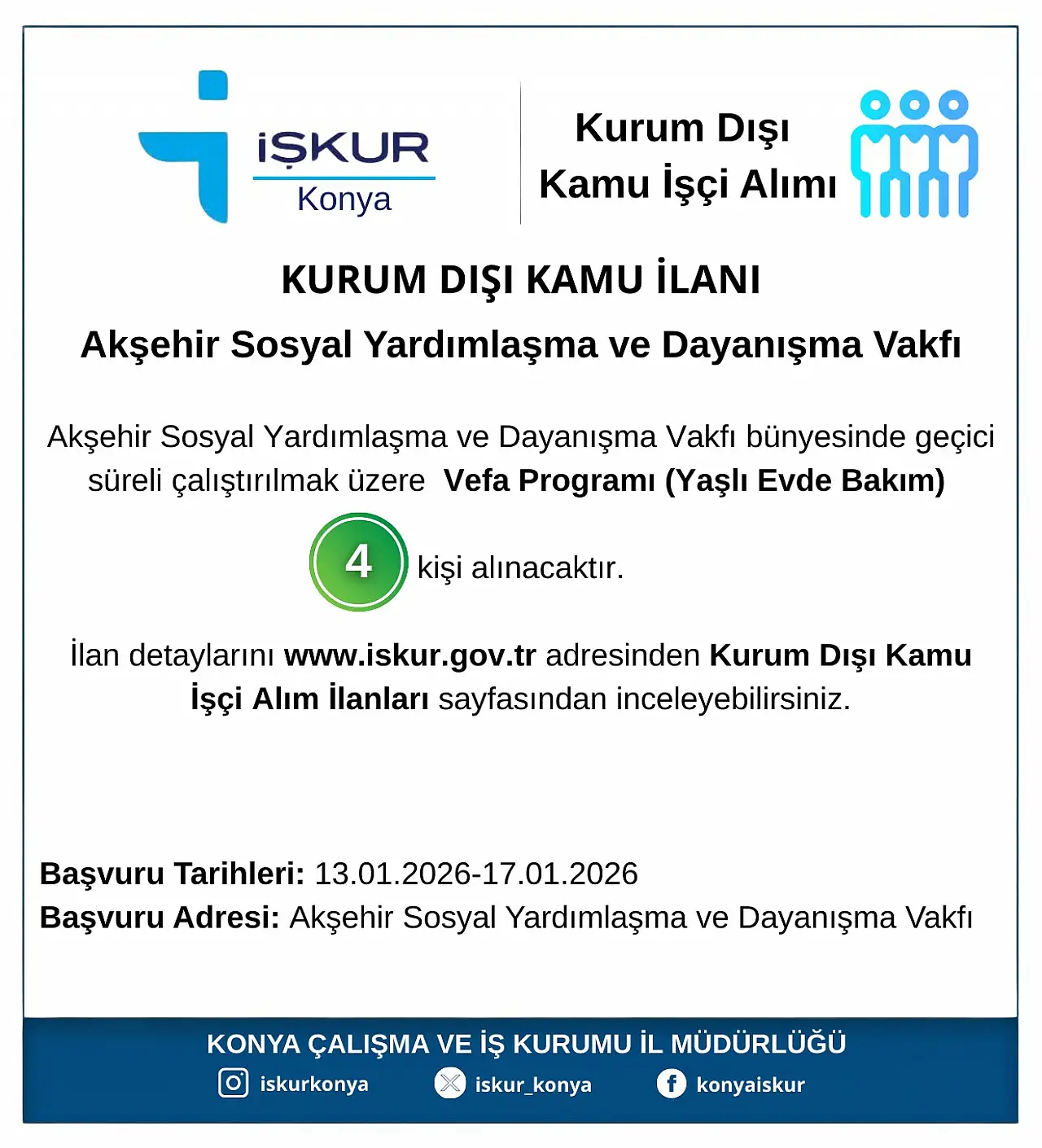 Konya Çalışma ve İş Kurumu İl Müdürlüğü tarafından yapılan duyuruya göre Akşehir Sosyal Yardımlaşma ve Dayanışma Vakfı bünyesinde yürütülen Vefa Programı (Yaşlı Evde Bakım) kapsamında görevlendirilmek üzere geçici süreli 4 personel alımı yapılacak. Yaşlı ve engelli vatandaşların ev temizliği, kişisel bakımı ve temel ihtiyaçlarının karşılanmasına yönelik hizmet verecek olan kadrolar için başvurular 13 Ocak 2026 tarihinde başlayıp 17 Ocak 2026 tarihine kadar devam edecek.