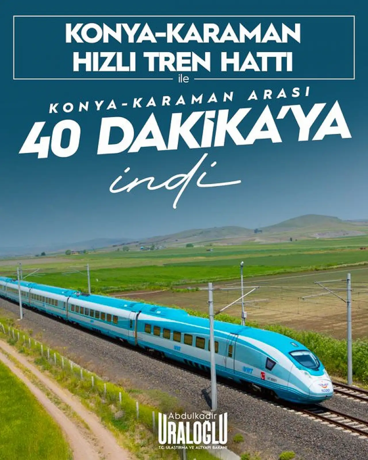 Ulaştırma ve Altyapı Bakanı Abdulkadir Uraloğlu, sosyal medya hesabı üzerinden yaptığı paylaşımla Konya–Karaman Hızlı Tren Hattı’nın bölge ulaşımındaki önemine dikkat çekti.