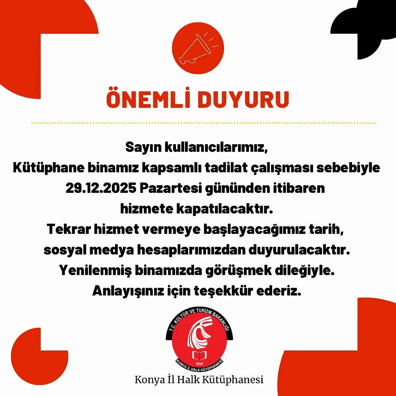 Konya’nın en önemli kültür duraklarından biri olan ve özellikle sınav dönemlerinde binlerce öğrenci ile kitapsevere ev sahipliği yapan Konya İl Halk Kütüphanesi, kapsamlı bir modernizasyon sürecine giriyor. Kütüphane yönetimi tarafından yapılan resmi duyuruya göre bina geniş çaplı bir tadilat çalışması nedeniyle 29 Aralık 2025 Pazartesi (yarın) gününden itibaren geçici bir süreyle hizmete kapatılacak.
