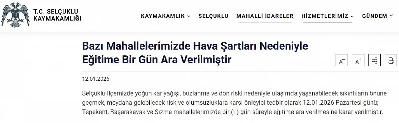 Kar tatili kararı Selçuklu ilçesinin tamamını kapsamazken hava şartlarının daha ağır seyrettiği belirli kırsal mahallelerle sınırlandırıldı. Yapılan duyuruya göre; Tepekent, Başarakavak ve Sızma mahallelerindeki tüm eğitim kurumlarında bir gün süreyle ders başı yapılmayacak.