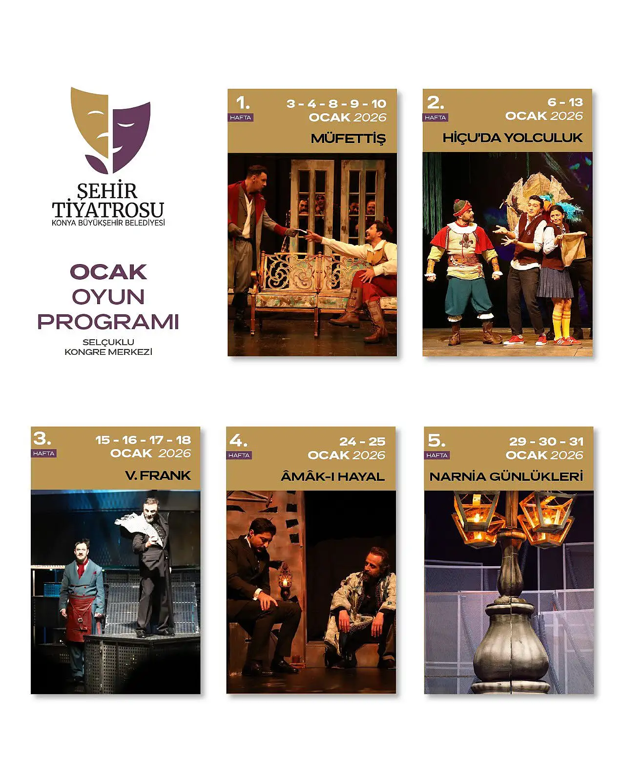 Konya Büyükşehir Belediyesi Şehir Tiyatrosu, 2026 yılına dopdolu bir programla giriş yaparken şehrin kültürel mirasını güçlendirmeye ve sanatseverleri Selçuklu Kongre Merkezi’nde buluşturmaya devam ediyor. Şehir Tiyatrosu sadece oyun sahnelemekle kalmayıp genç nesillerin sanatla bağ kurmasında da kilit bir rol üstleniyor. Bu vizyon doğrultusunda hazırlanan Ocak ayı programı; "Müfettiş", "Hiçu’da Yolculuk", "V. Frank", "Âmâk-ı Hayal" ve "Narnia Günlükleri" gibi seçkin eserlerle izleyicilere adeta bir kültür şöleni vaat ediyor.
