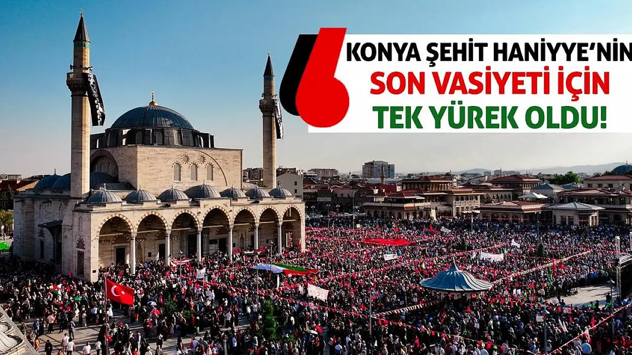 Binlerce Konyalı Hamas Lideri Şehit İsmail Heniyye'nin vasiyetini yerine getirmek için Mevlana Meydanı'nda buluştu.Konya protokolünün de katıldığı mitingde Filistin ve Türk bayrakları meydanı donattı.