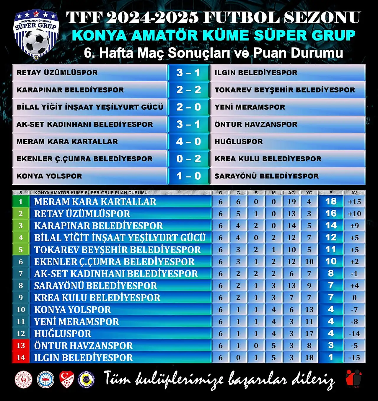 Namağlup ilerleyen Meram Kara Kartallar evinde konuk ettiği Huğluspor'u 4-0 mağlup etti. Büyük çekişmeye sahne olan ve 4 golün çıktığı Karapınar Belediyespor - Beyşehir Belediyespor karşılaşması ise 2-2 sona erdi.