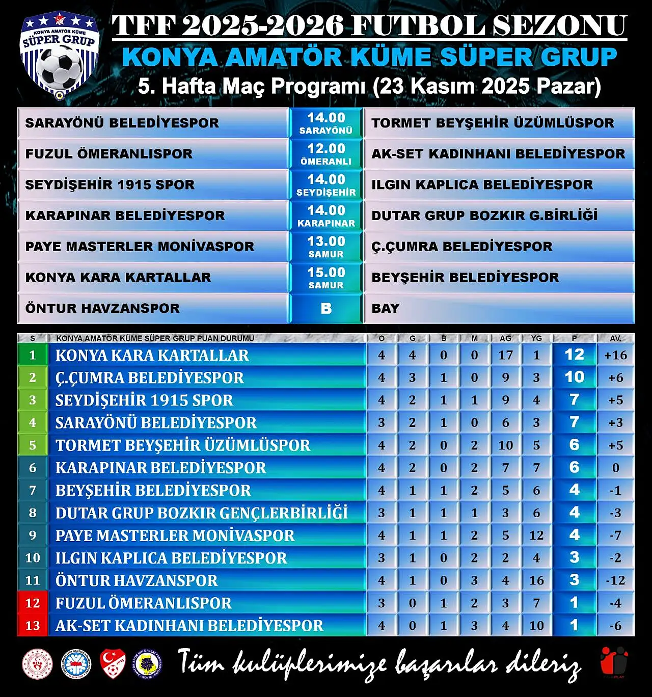 Öntur Havzanspor, fikstür gereği haftayı Bay olarak geçecek. Konya Kara Kartallar, oynadığı 4 maçı da kazanarak haftaya 12 puanla zirvede giriyor. Çumra Belediyespor ise 10 puanla ikinci sırada yer alıyor.
