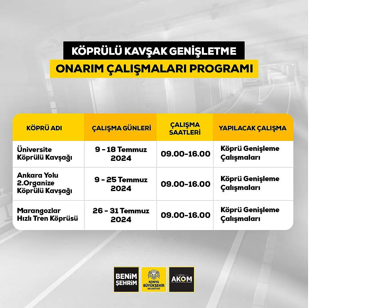 9 Temmuz Salı günü Selçuk Üniversitesi Köprülü Kavşağı'nda başlayacak olan çalışma 31 Temmuz Çarşamba günü Marangozlar Hızlı Tren Köprüsü'nde sona erecek.