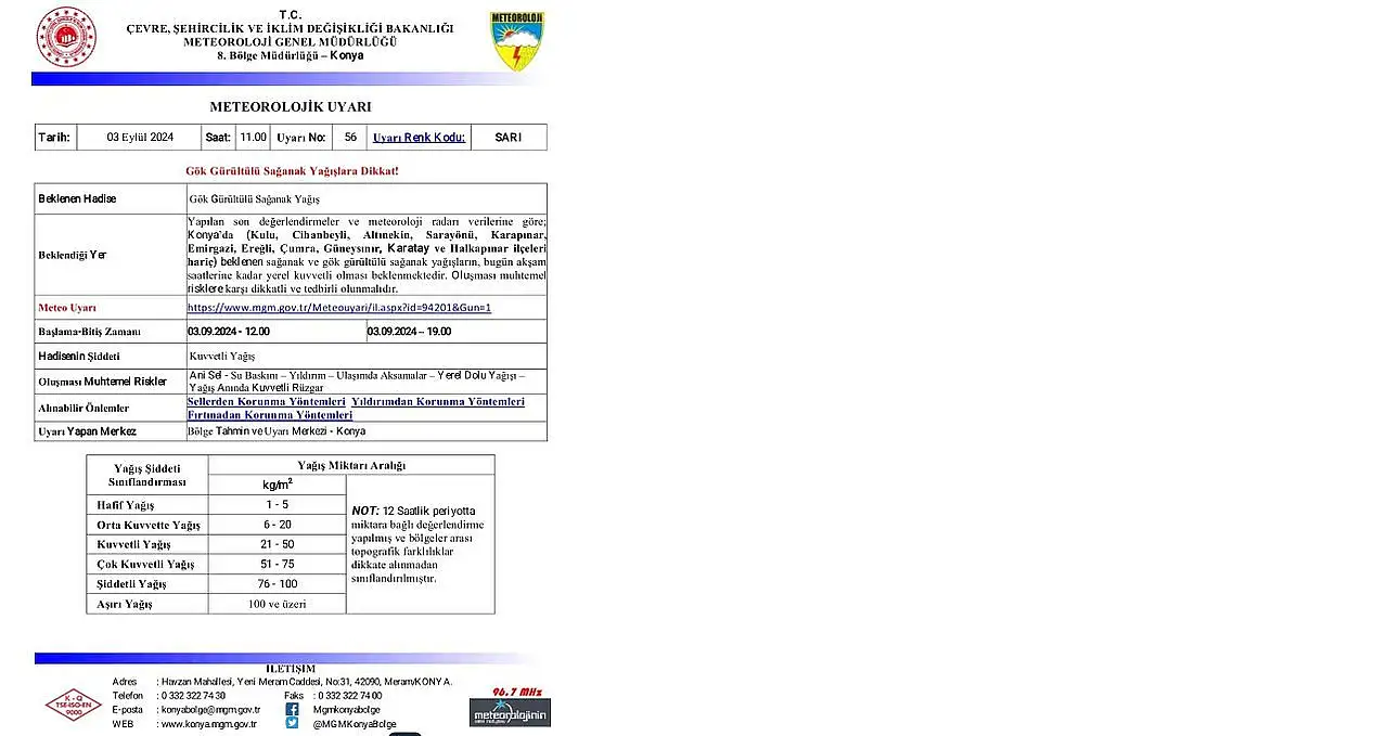 Konya'nın Kulu, Cihanbeyli, Altınekin, Sarayönü, Karapınar, Emirgazi, Ereğli, Çumra, Güneysınır, Karatay ve Halkapınar ilçeleri hariç 20 ilçesinde sağanak yağış bekleniyor.