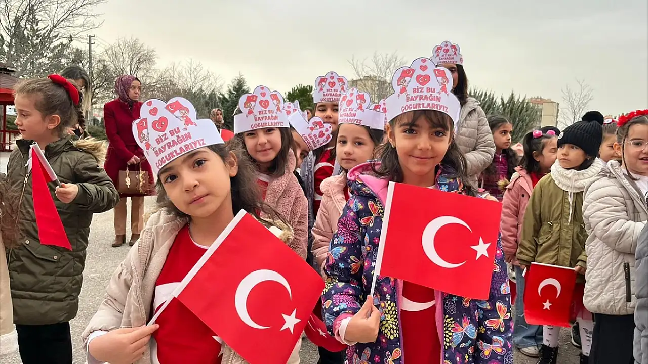 Merkez Selçuklu ilçesindeki Nesrin ve Ayşegül Kardeşler İlkokulu'nda kırmızı-beyaz kıyafet giyen öğrenciler, sınıflarında öğretmenlerinden günün anlam ve önemini öğrenerek, ellerindeki Türk bayraklarını salladı.