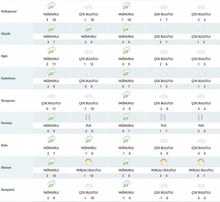 Konya zemheri soğuklarını kuru ayazla atlatmakla kalmayacak. Yüksek kesimlerde gerçekleşen kar yağışları ilçelerde de etkisini gösterecek. 23 Aralık Salı günü Konya’nın 26 ilçesinde yağış beklenirken Derebucak ve Taşkent ilçelerinde karla karışık yağmur bekleniyor. Emirgazi, Ereğli ve Karapınar ilçelerinde ise yağış beklenmiyor. Haftalık hava durumuna göre ise önümüzdeki günlerde bazı ilçelerde yağışın devam edeceği öngörülüyor.