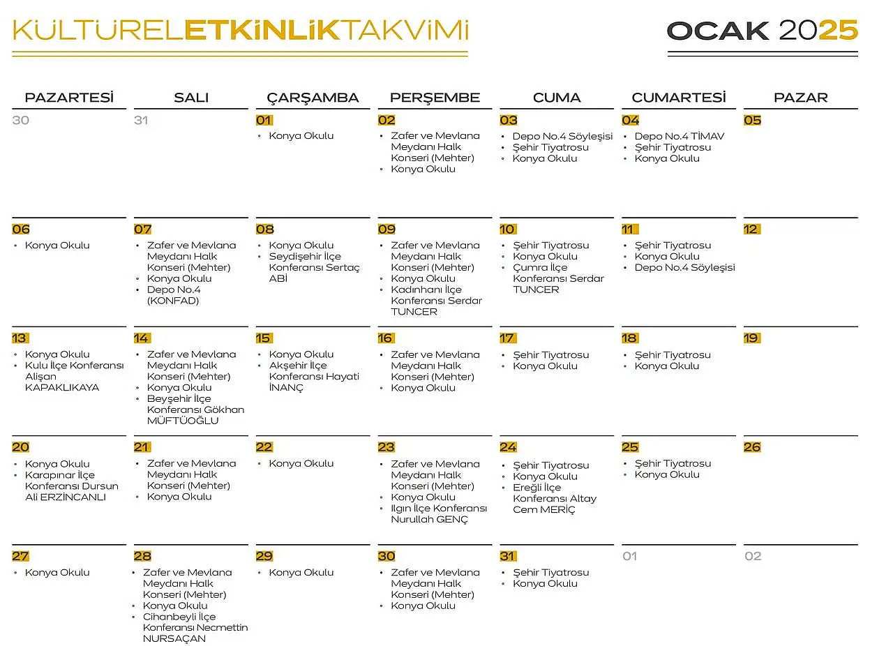 Konya Büyükşehir Belediyesi tarafından Ocak ayında planlanan etkinlikler ‘Ocak Ayı Kültürel Etkinlik Takvimi’ başlığıyla duyuruldu. Konya Okulu, Şehir Tiyatrosu, Depo No.4 Söyleşisi ve Zafer ve Mevlana Meydanı Halk Konserinin yanında Konya’nın 10 ilçesinde çeşitli konferanslar düzenlenecek.