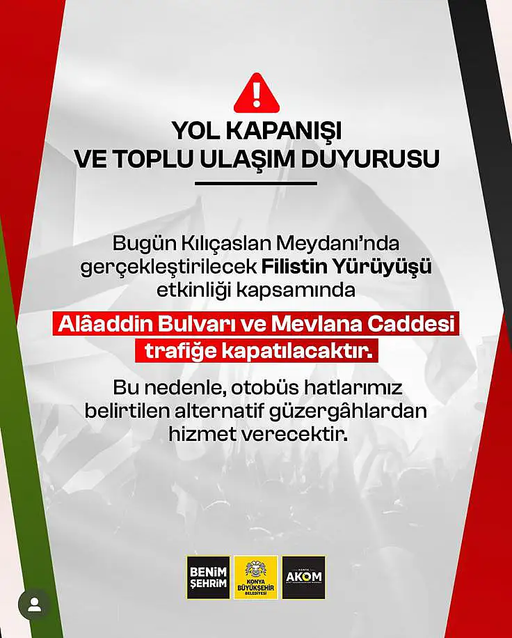 Konya'da bugün (7 Ekim 2025) Kılıçarslan Meydanı'nda düzenlenecek olan Filistin Yürüyüşü etkinliği nedeniyle bazı yollar trafiğe kapatılacak. Bu kapsamda şehir merkezindeki toplu ulaşım güzergahlarında geçici düzenlemeler yapıldı. Konya Büyükşehir Belediyesi Afet Koordinasyon Merkezi (AKOM) vatandaşların mağduriyet yaşamaması için alternatif güzergahları sosyal medya hesabından duyurdu.