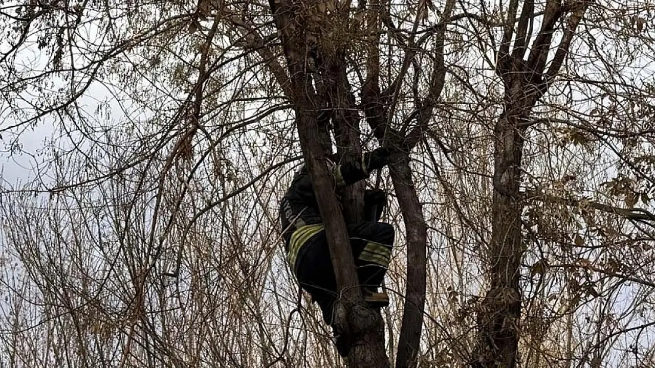 Konya'da ağaçta mahsur kalan kediyi itfaiye kurtardı