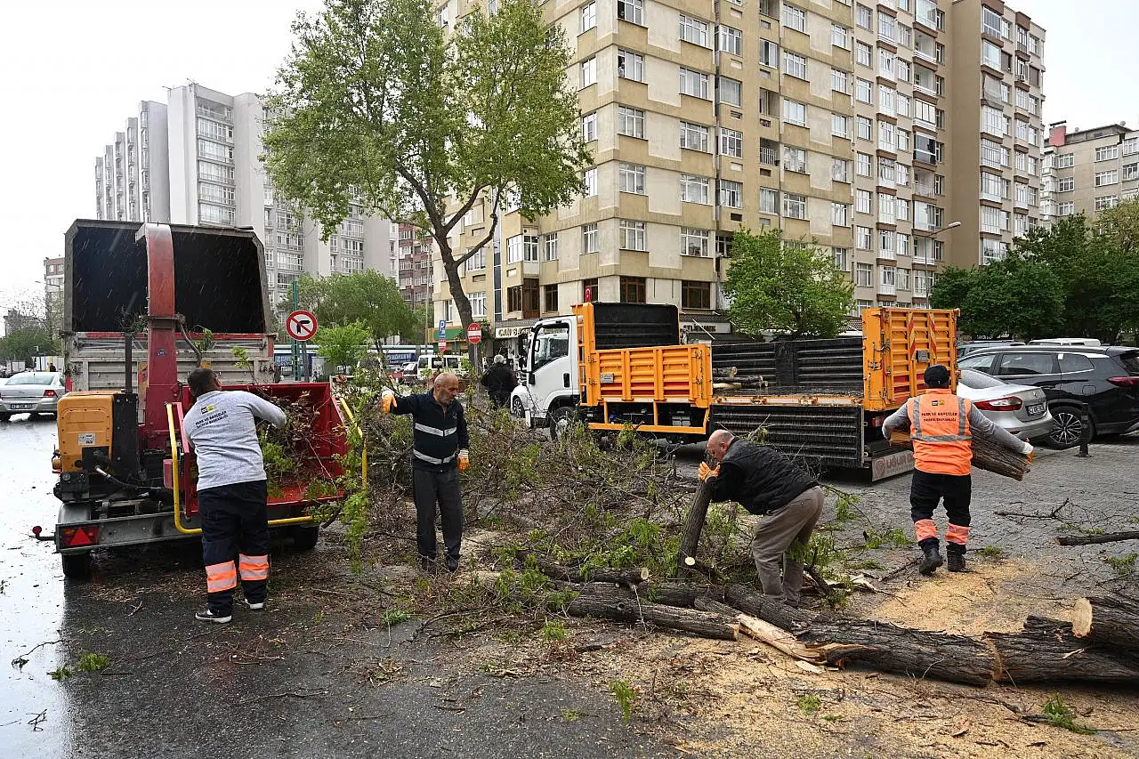 Çalışmalara devam eden Büyükşehir Belediyesi ekipleri fırtına sebebiyle kırılan ağaçları keserek kamyonlara yükleyip kaldırıyor.