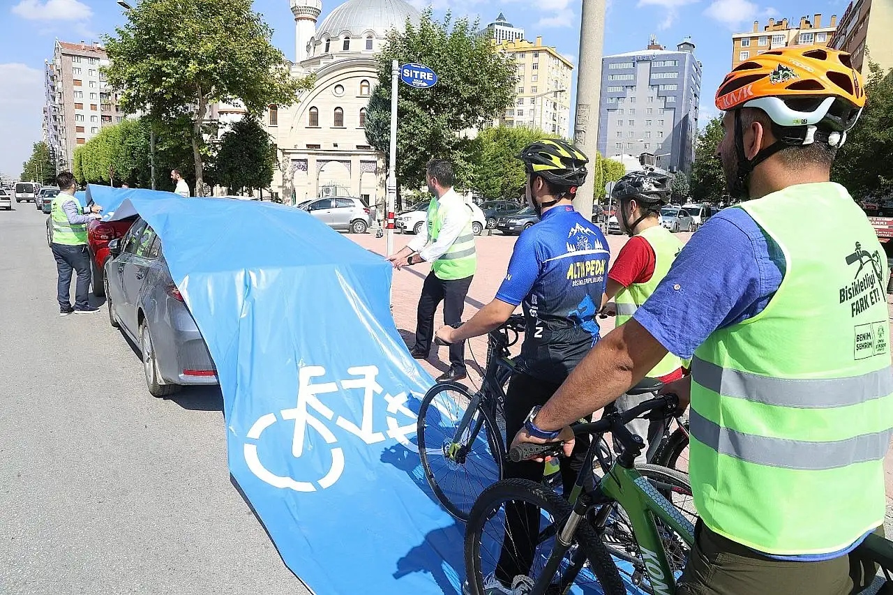 Konyalı bisikletseverler, 'Avrupa Hareketlilik Haftası' çerçevesinde şehir merkezinde bisiklet yoluna park eden araçların üzerini mavi brandalarla kaplayarak bisiklet yolunun işgal edilmemesi gerektiğine dikkati çekti.Konyalı bisikletsever Haluk Ay, 10 yı