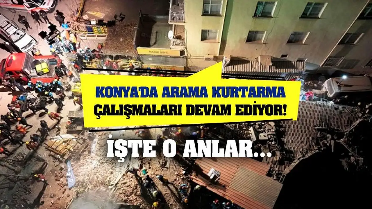 Akşam saatlerinde merkez Selçuklu ilçesi Yenişehir Caddesi üzerinde bulunan 4 katlı bina büyük bir gürültüyle çöktü. Binanın enkazında beş kişinin kaldığının bildirilmesi üzerine adrese çok sayıda kurtarma ekibi sevk edildi. Polis ekipleri bina etrafında güvenlik önlemi alırken, kurtarma ekipleri de enkaz altında kalan kişileri kurtarmak için çalışma başlattı. Çalışmalar devam ettiği sırada yapılan tespitlerde üç kişiye canlı ulaşıldı. Enkaz üzerindeki kurtarma ekipleri koridor oluşturarak enkazdan üç kişiyi sedyeyle çıkardı. Sağ olarak kurtarılan üç kişi daha sonra olay yerinde bekleyen ambulanslarla kaldırıldıkları hastanede tedavi altına alındı.