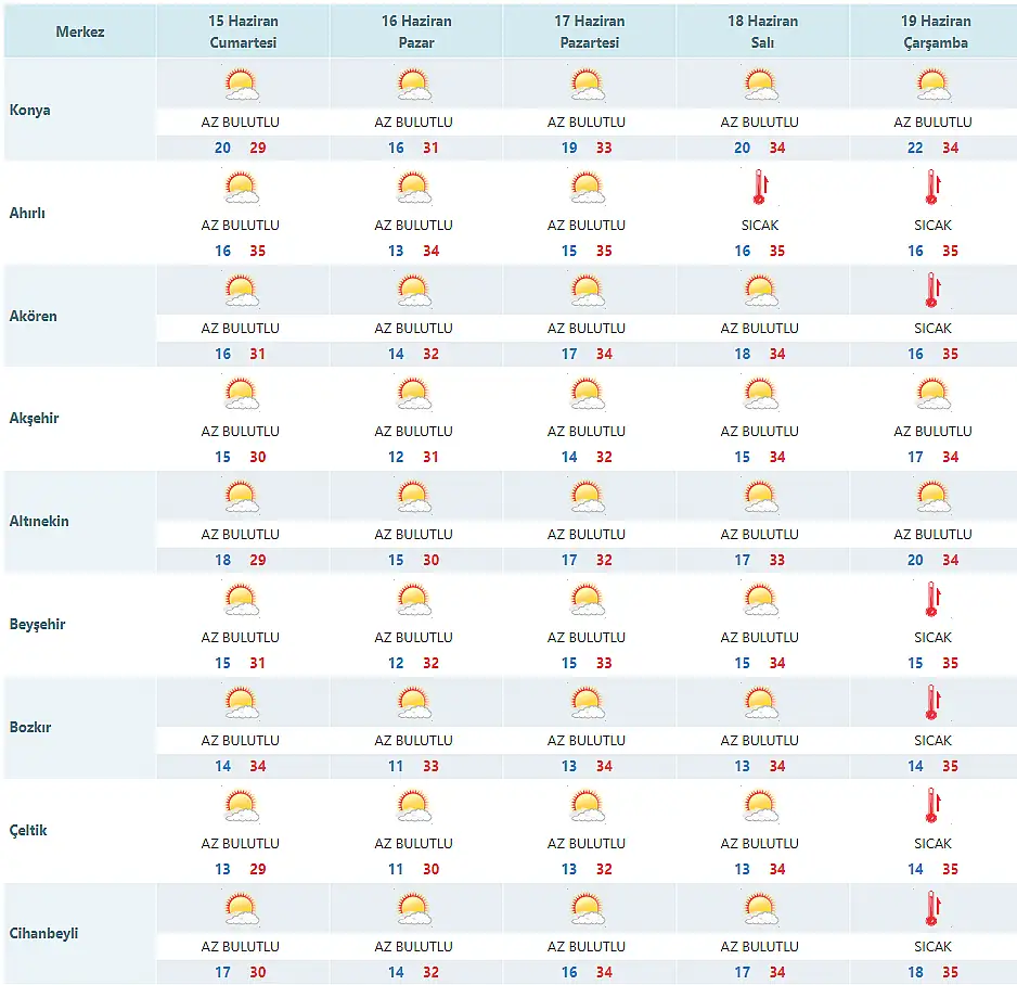 Meteoroloji Genel Müdürlüğü tarafından yayınlanan 5 günlük hava tahmin raporu yayınlandı. Konya'da yeni haftada güneşin etkisi sürecek. Peki, 16 Haziran(yarın) Konya’da hava durumu nasıl olacak? İşte Konya’da hava durumu ile ilgili son dakika gelişmeleri…
