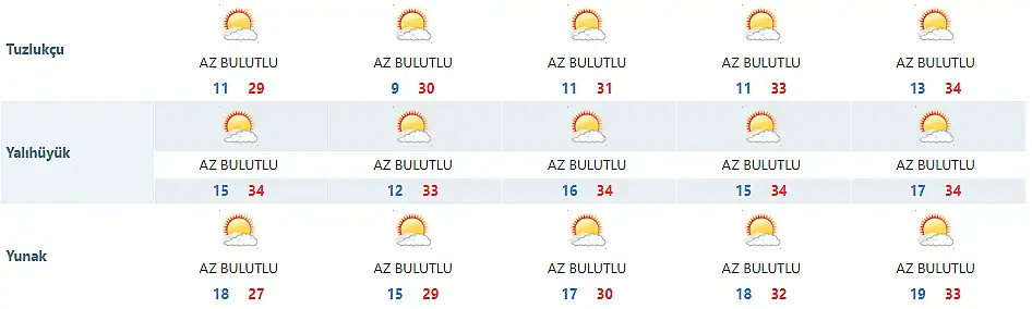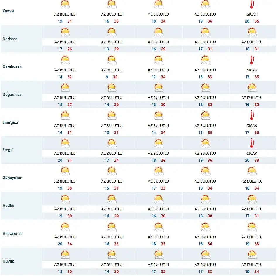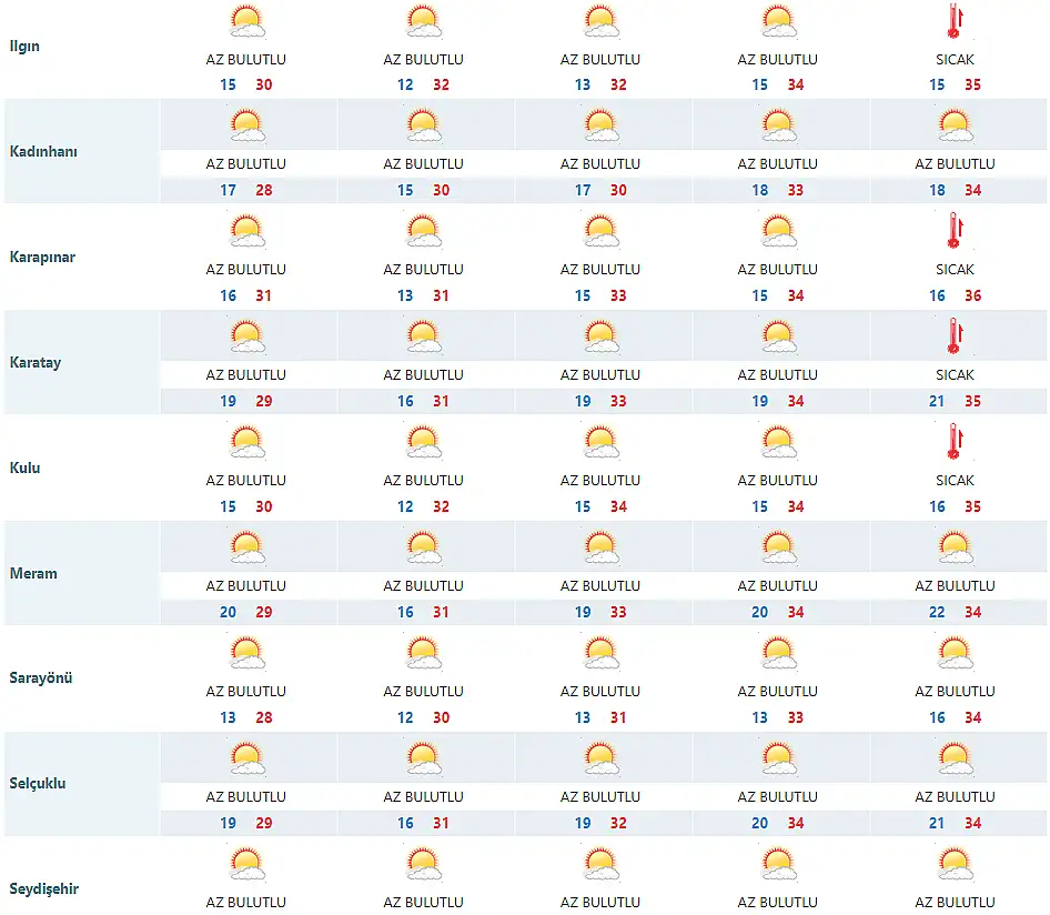 Meteoroloji 8. Bölge Müdürlüğü, tarafından yapılan son tahmine göre Konya'nın merkez ve ilçelerinde en düşük ve en yüksek sıcaklık dereceleri ise şu şekilde;