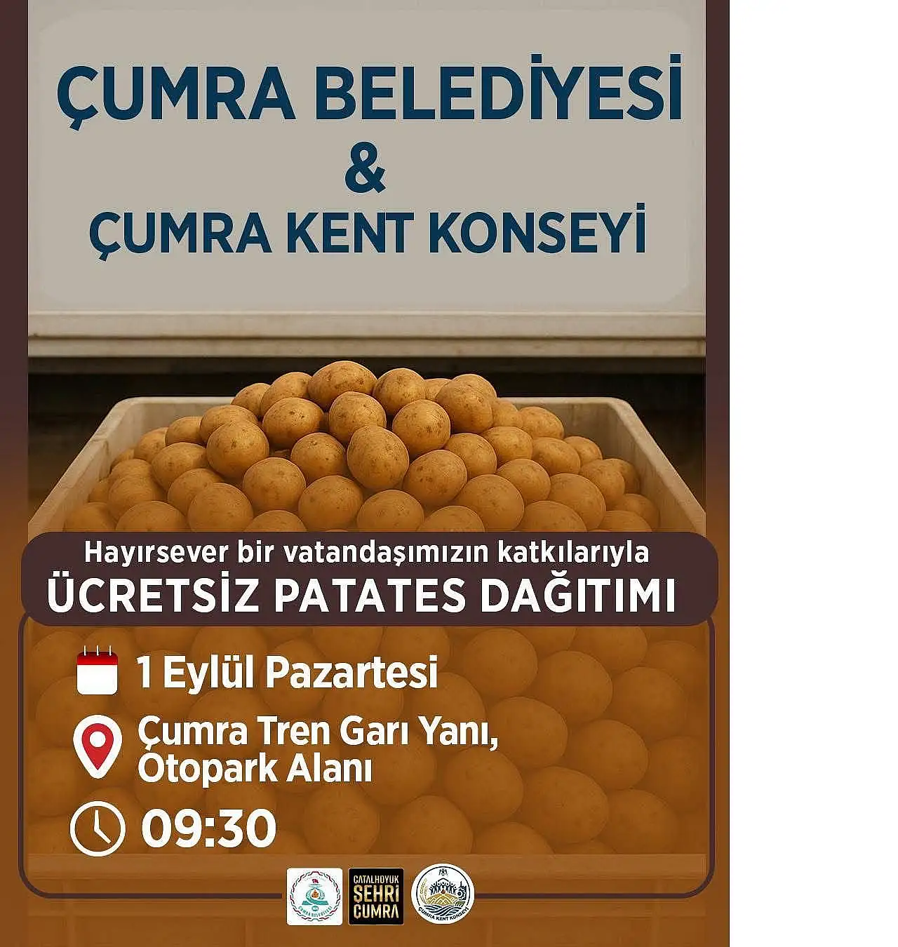 Çumra'da hayırsever bir vatandaşın katkılarıyla patates dağıtımı yapılacak.Yarın (1 Eylül Pazartesi) Çumra Belediyesi ve Çumra Kent Konseyi iş birliğiyle 'Ücretsiz Patates Dağıtımı' gerçekleştirilecek.