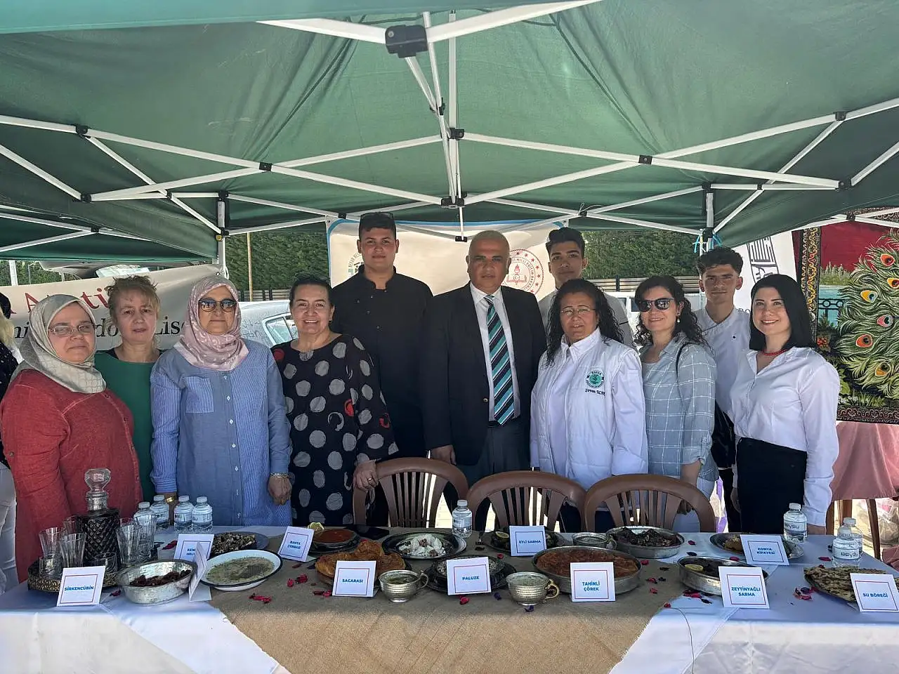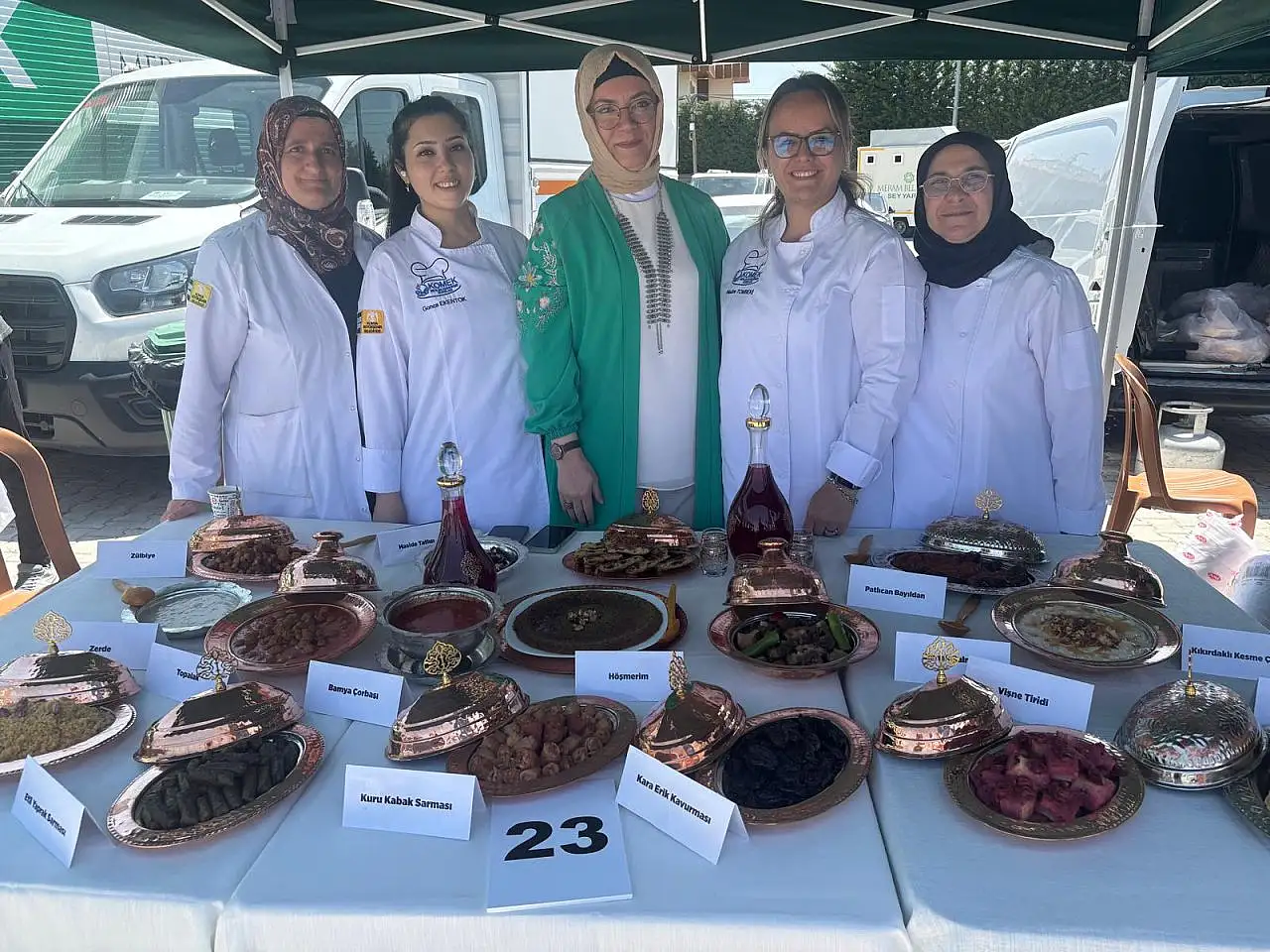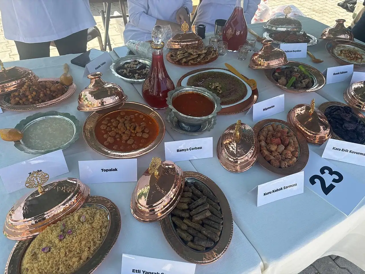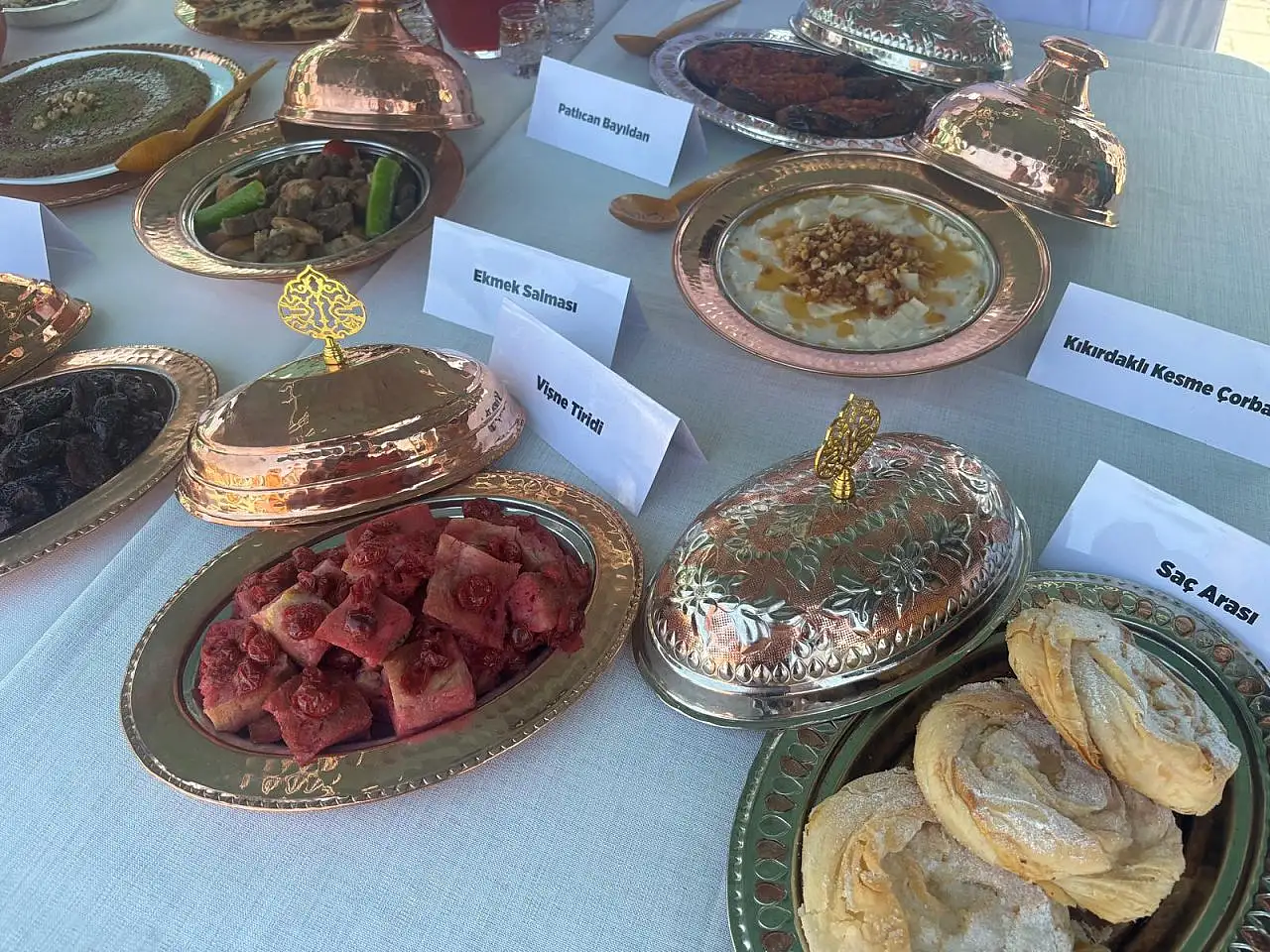 Eskiden yapılan ama şimdiler de unutulmaya yüz tutmuş olan yemekleri tekrardan hatırlatmak için burada sergiliyoruz. Burada haside helvası, vişneli tirit, kuru kabak dolması, patlıcan bayıldan gibi unutulan yemekler var. Haside helvası, bir nevi pekmezden yapılmış un helvası diyebiliriz. Un tereyağında kavrulduktan sonra şerbet yerine pekmez ilave ediyoruz. Cevizli sucukları yaparken dışını kapladığımız katmanı biz helva olarak servis ediyoruz” diye konuştu.