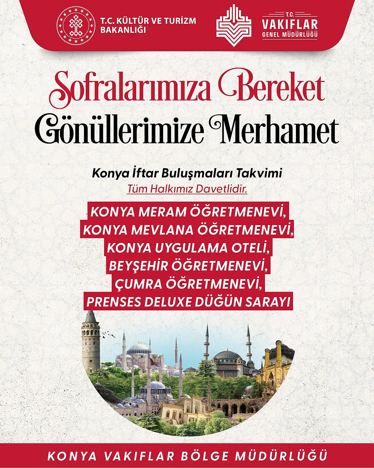 Bu çerçevede Konya Bölge Müdürlüğü de Konya’da Selçuklu Prenses Deluxe Düğün Sarayı, Meram Öğretmen Evi, Mevlana Öğretmen Evi, Karatay Borsa İstanbul Gazi Mustafa Kemal Turizm Mesleki ve Teknik Anadolu Lisesi (Otelcilik ve Turizm Meslek Lisesi), Çumra Öğretmenevi, Beyşehir Öğretmenevi Aksaray’da Uluırmak Turizm Mesleki ve Teknik Anadolu Lisesi, Aksaray Öğretmenevi ve Aso Müdürlüğü ve Karaman’da Karaman Polisevinde iftar sofraları kuracak."
