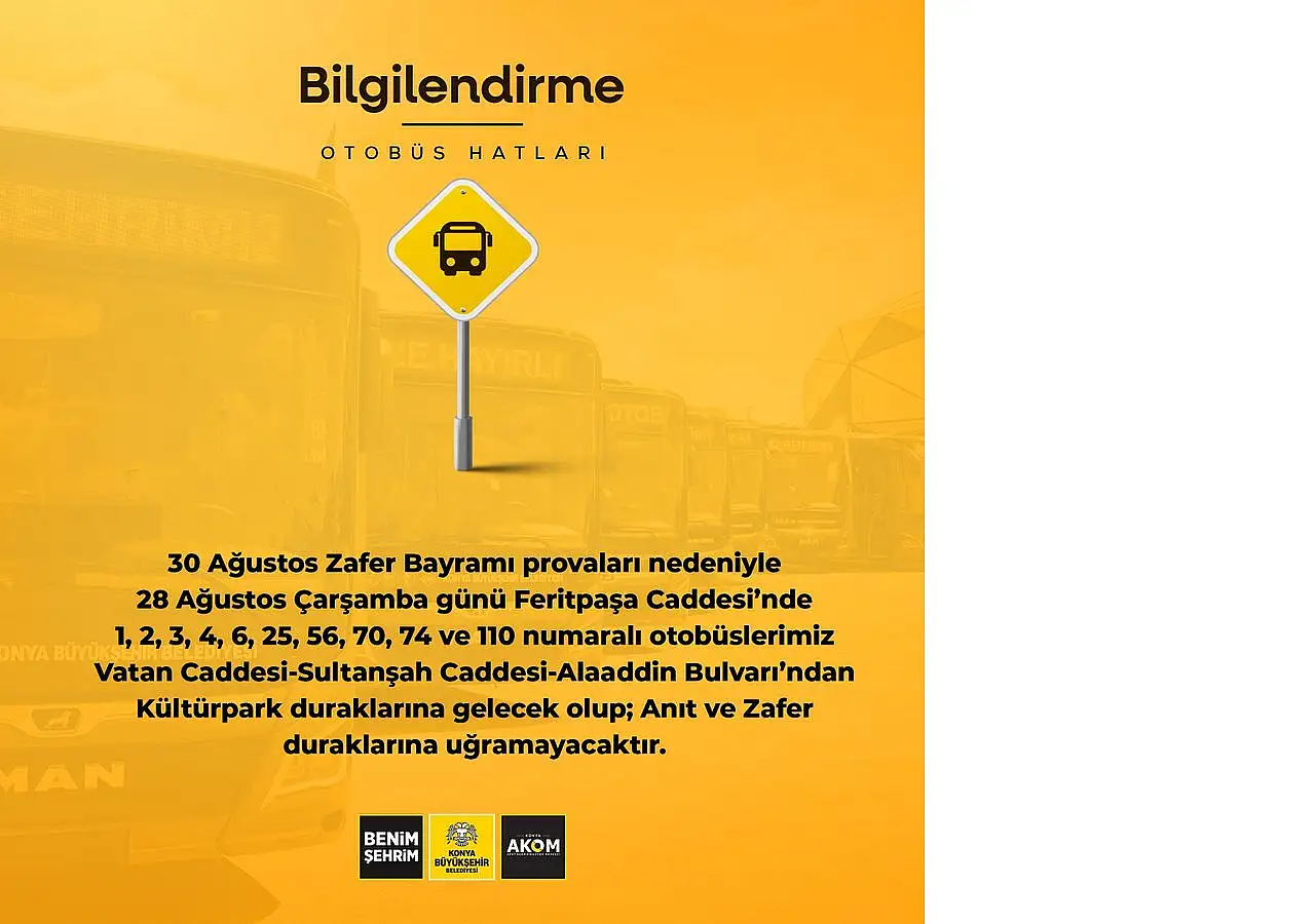 Konya Büyükşehir Belediyesi Afet Koordinasyon Merkezi sosyal medya hesabından yaptığı paylaşımla 28 Ağustos Perşembe günü yapılacak olan 30 Ağustos Zafer Bayramı provaları nedeniyle otobüs güzergahlarının değişeceğini duyurdu.