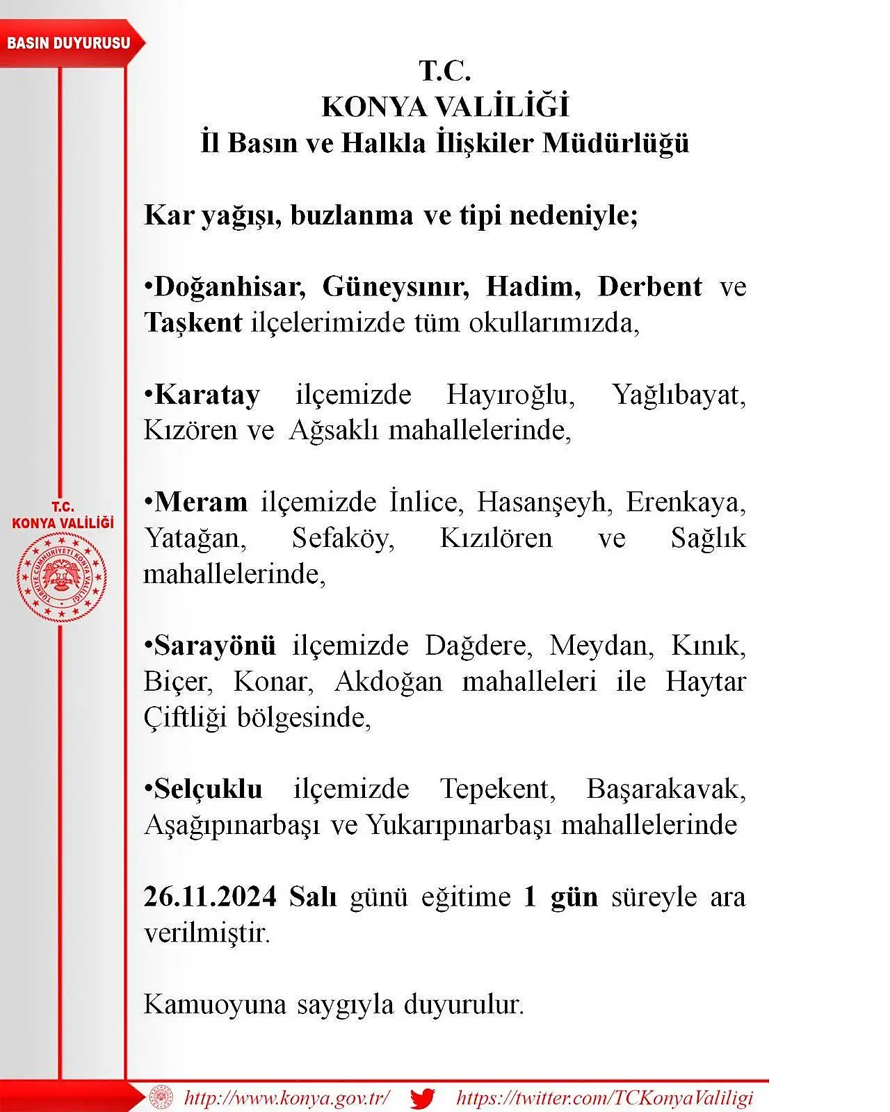 Konya Valiliği kar yağışı, buzlanma ve tipi nedeniyle eğitime 1 gün daha ara verilen ilçeleri açıkladı.KONYA'DA 26 KASIM SALI GÜNÜ 5 İLÇEDE OKULLAR TATİL Doğanhisar, Güneysınır, Hadim, Derbent ve Taşkent ilçelerinde tüm okullarda eğitime bir gün ara veril