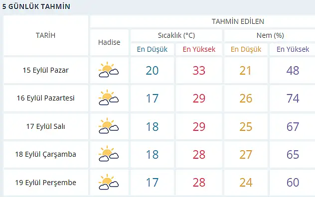 Tahminlere göre Konya’da hava sıcaklıklarının 11 ve 33 derece aralığında olacağı tahmin ediliyor. 15 Eylül Pazar(yarın) havanın 30 derece ve parçalı bulutlu olacağı belirtildi.