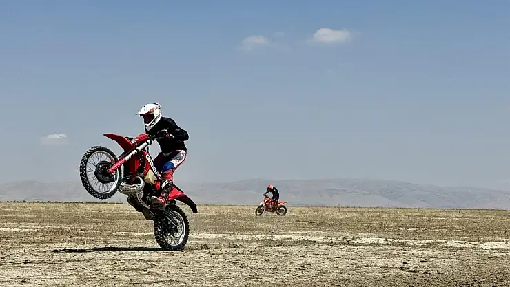 Konya'da motosiklet sporcuları, iklim değişikliği ve kuraklıktan kuruyan Akşehir Gölü'ne dikkati çekmek için çorak araziye dönen yerde sürüş yaptı.Aralarında enduroda dereceler elde etmiş sporcuların da yer aldığı 10 motosikletli, çevresel afetlere dikkat