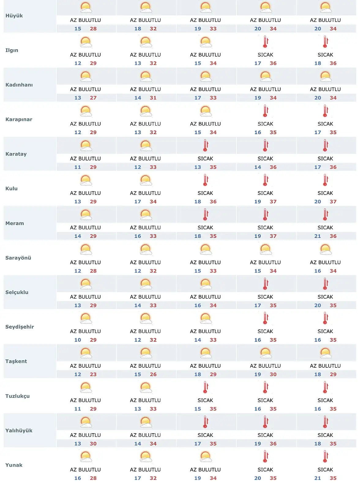 Meteoroloji 8. Bölge Müdürlüğü, tarafından yapılan son tahmine göre Konya'nın merkez ve ilçelerinde en düşük ve en yüksek sıcaklık dereceleri ise şöyle olacak:
