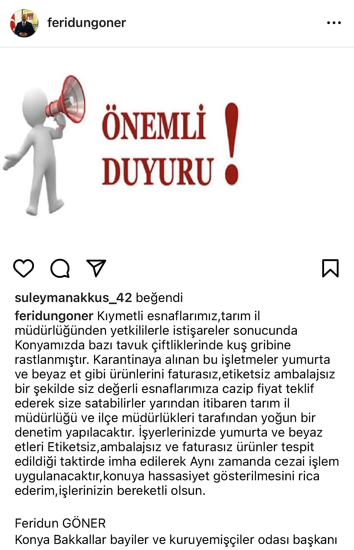 "Kıymetli esnaflarımız, Tarım İl Müdürlüğü'nden yetkililerle istişareler sonucunda Konyamızda bazı tavuk çiftliklerinde kuş gribine rastlanmıştır. Karantinaya alınan bu işletmeler yumurta ve beyaz et gibi ürünlerini faturasız, etiketsiz ambalajsız bir şekilde siz değerli esnaflarımıza cazip fiyat teklif ederek size satabilirler yarından itibaren tarım il müdürlüğü ve ilçe müdürlükleri tarafından yoğun bir denetim yapılacaktır. İşyerlerinizde yumurta ve beyaz etleri Etiketsiz, ambalajsız ve faturasız ürünler tespit edildiği taktirde imha edilerek Aynı zamanda cezai işlem uygulanacaktır. Konuya hassasiyet gösterilmesini rica ederim, işlerinizin bereketli olsun."