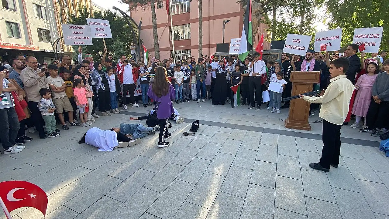Ellerinde Türk ve Filistin bayrakları olan vatandaşlar İsrail'i lanetledi. Etkinlikte Kur'an-ı Kerim tilaveti ve Filistin isimli şiir okundu. Filistin'de öldürülen çocukları temsilen bazı çocuklar yere yatarken, İsrail lanetlendi.