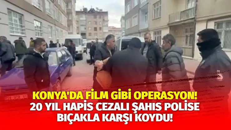 Konya'da hakkında yağmacılık suçundan 20 yıl hapis cezası bulunan şahıs, polis ekiplerini fark edince arkadaşlarıyla birlikte ekiplere bıçak ve tabancayla mukavemet gösterdi.Adreste bulunan 5 kişi, kısa sürede etkisiz hale getirilerek gözaltına alındı.