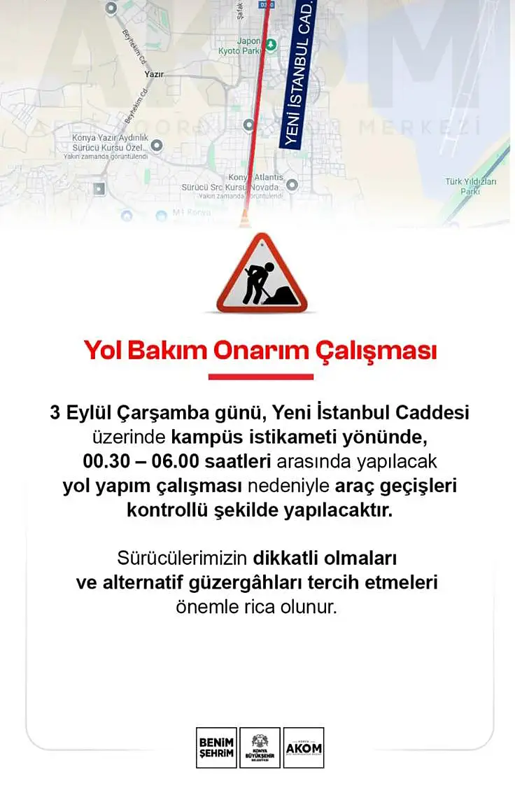 Konya Afet ve Koordinasyon Merkezi (AKOM), Yeni İstanbul Caddesi'nde yapılacak yol bakım ve onarım çalışması nedeniyle 3 Eylül Çarşamba günü gece saatlerinde 6 saat çalışma yapılacağını duyurdu.3 Eylül Çarşamba günü kampüs istikametinde gerçekleştirilecek
