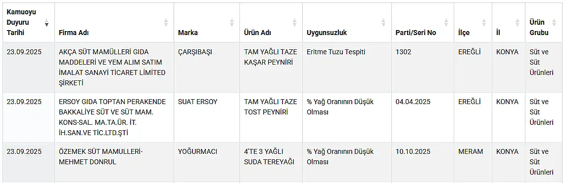 Tarım ve Orman Bakanlığı, Konya'daki gıda firmalarını ifşa etti. Tarım ve Orman Bakanlığı 23 Eylül tarihinde yayımladığı güncel "Taklit veya Tağşiş Yapılan Gıdalar" listesiyle gıda güvenliğine aykırı faaliyet gösteren firmaları kamuoyuna duyurdu. Listede Konya'da bulunan çeşitli firmalara ait içeriğine farklı maddeler eklenmiş veya temel özellikleri eksik ürünler yer aldı.