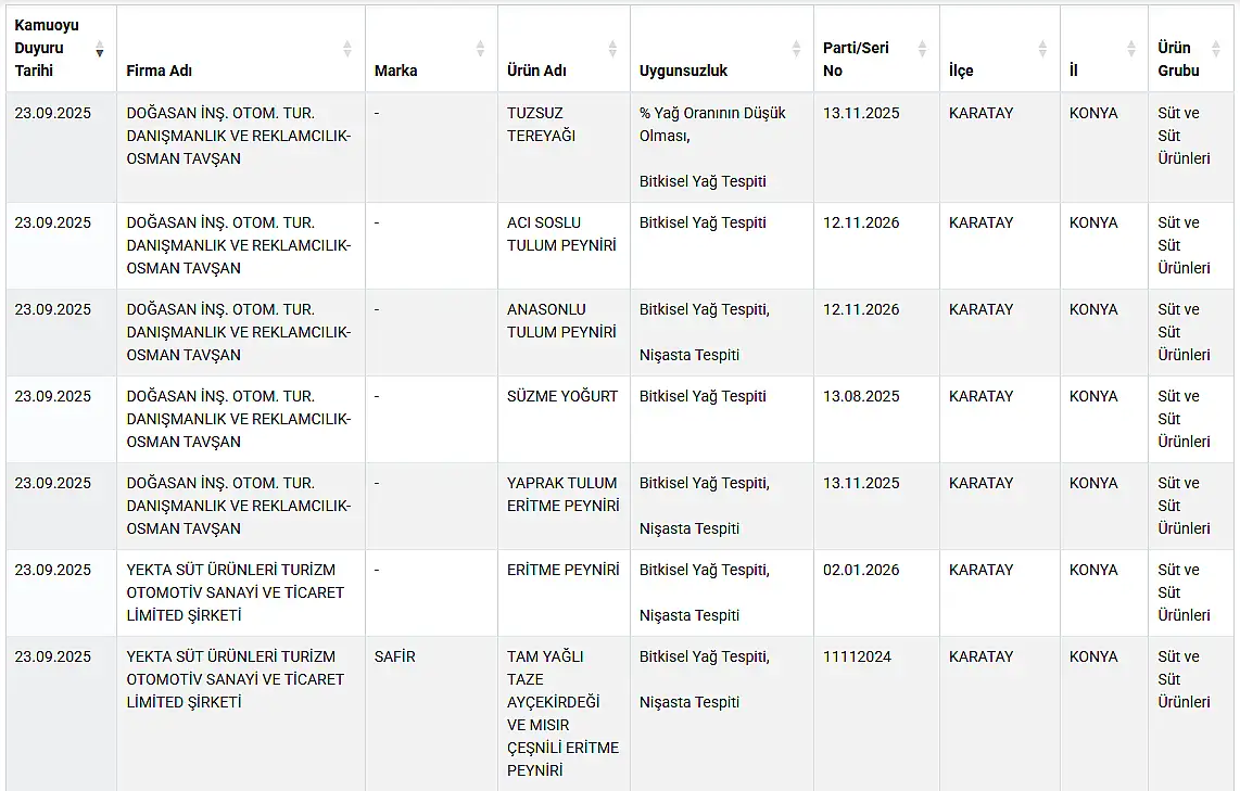 Tuzsuz Tereyağı, Acı Soslu Tulum Peyniri, Anasonlu Tulum Peyniri, Süzme Yoğurt, Yaprak Tulum Eritme Peynirinde Yağ Oranı Düşüklüğü, Bitkisel Yağ ve Nişasta Tespiti bulundu. Ayrıca yine Doğasan firmasına ait Süzme Çiçek Balında
