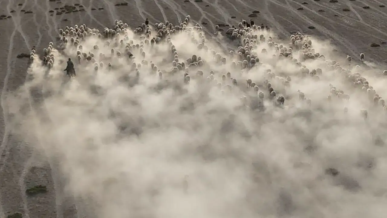 Gün batımına doğru dron ile kaydedilen görüntülerde sürünün ilerleyişi adeta bir tabloyu andırdı. Koyunlar, nizami bir şekilde sıralanarak ağıllarına doğru ilerlerken, oluşan toz bulutlarıyla birlikte görsel bir şölen sundu.