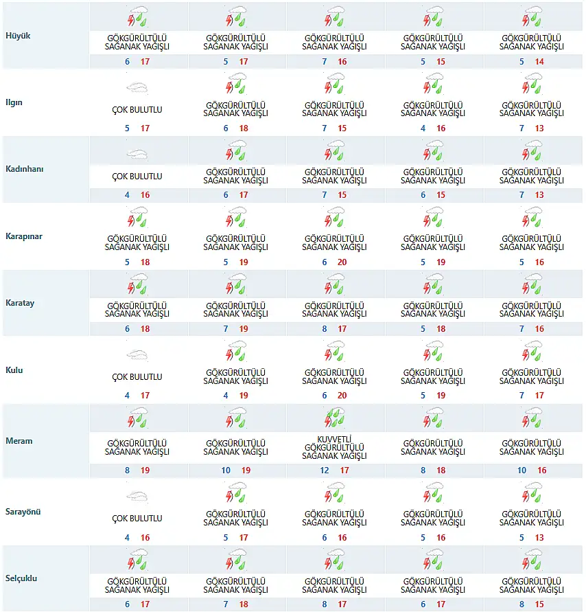 Meteoroloji 8. Bölge Müdürlüğü, tarafından yapılan son tahmine göre Konya merkezde ve ilçelerinde en düşük ve en yüksek sıcaklık dereceleri ise şöyle olacak: