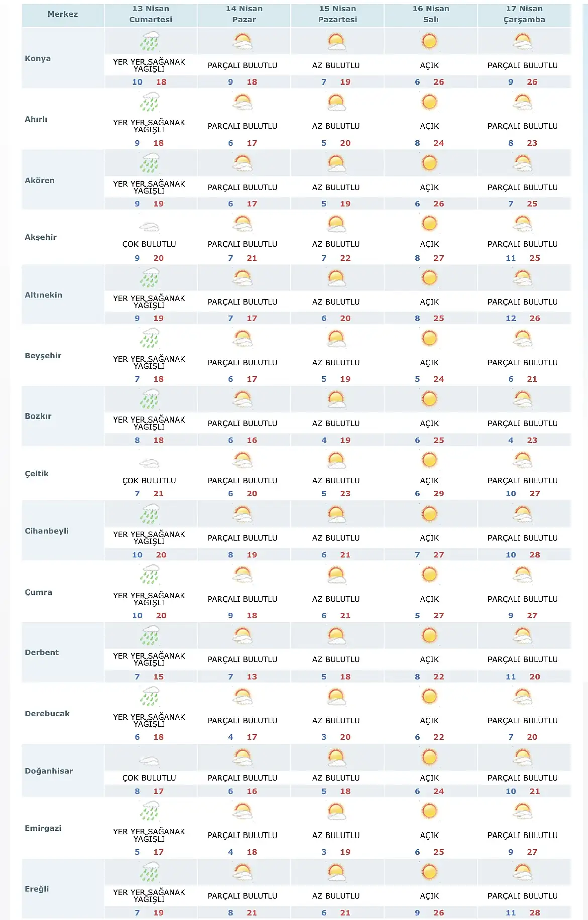 Meteoroloji 8. Bölge Müdürlüğü, tarafından yapılan son tahmine göre Konya'nın merkez ve ilçelerinde en düşük ve en yüksek sıcaklık dereceleri ise şöyle olacak: