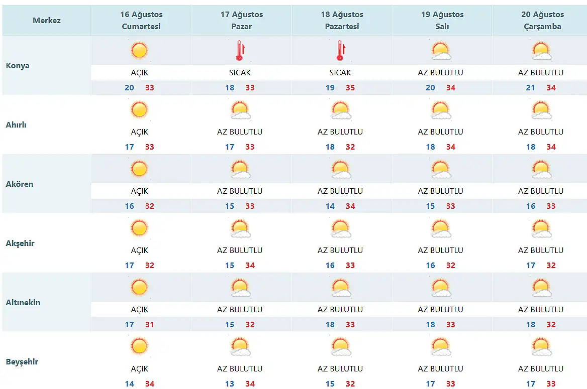 Meteoroloji Genel Müdürlüğü’nden alınan verilere göre Konya’da hafta sonu yazı aratmayan bir hava bekleniyor. Kent merkezinde sıcaklıkların 34 dereceye kadar çıkacağı, güneşli bir havanın etkili olacağı tahmin ediliyor.